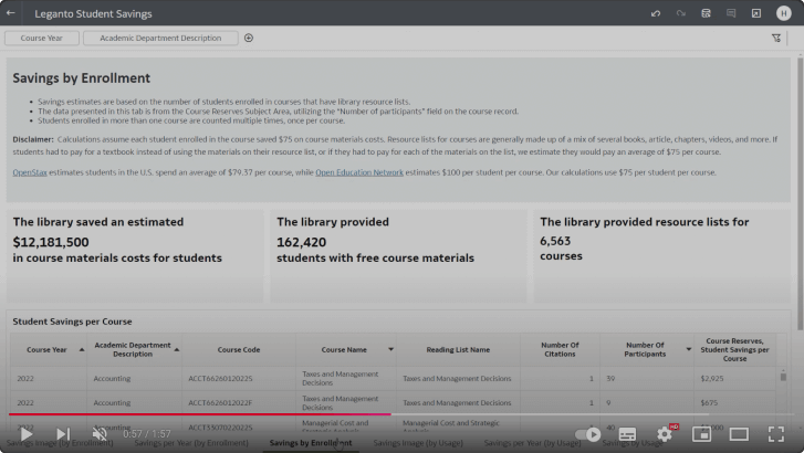 Resource list data and comprehensive usage data are logged in Leganto, providing libraries with the insights needed to make informed decisions about acquisitions and licensing options. This data also helps recommend relevant materials to instructors for their courses. With Leganto, libraries can ensure their collections optimally support the curriculum and suggest less expensive yet high-quality alternative resources. Additionally, library staff can confidently cancel subscriptions to rarely used journals or adjust the number of concurrent licenses for e-books. Instructors can use these data-based insights to shape and improve future reading lists, making course resources more affordable and engaging.