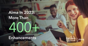 The end of the 2023 is approaching and it’s been another successful year for Alma. The combination of new features and functionality, additional customers choosing and implementing the service, and a vision to further leverage forward-looking technology is taking Alma to a new level in the area of library unified resource management.