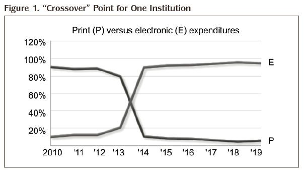 Typically, expenditures for physical format material in 2010 exceeded those for electronic format material. By 2019, however, expenditures for electronic formats were greater. The “crossover,” when expenditures on electronic resources surpassed those for physical materials, usually occurred between 2013 and 2016. Figure 1 shows the crossover point for one institution, which began spending less on print and more on electronic formats between 2013 and 2014.