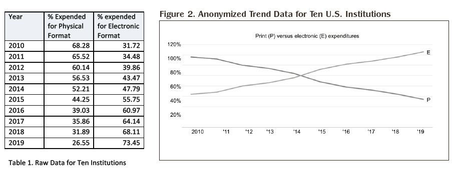 At the time of this research (November 2020), there were 948 institutions in the United States using Ex Libris Alma, a uniquely comprehensive cloud-based software as a service (SAAS) library services platform (LSP). Data from these institutions, for those of whom there is at least ten years of transaction data, was processed with Alma Analytics to identify expenditure trends. Alma Analytics has the capability, for example, to measure, track, and differentiate between expenditures for physical and electronic materials.