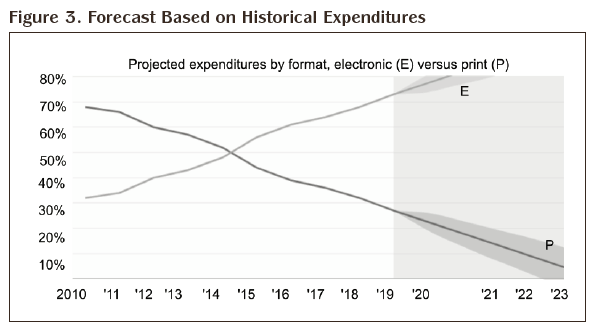 Empirical evidence indicates that academic institutions in the United States have increased library expenditures for electronic resources and decreased expenditures for physical resources. According to the forecast, this trend will continue. However, a factor not taken into account by forecasting algorithms is the impact of COVID-19. As noted above, the pandemic has increased awareness of electronic resources, which can be expected to cause increased use of those resources in the coming years, especially if potential patrons remain off-campus and access to the physical library remains limited. Such a situation would prevent many people from using and borrowing physical items from the library.