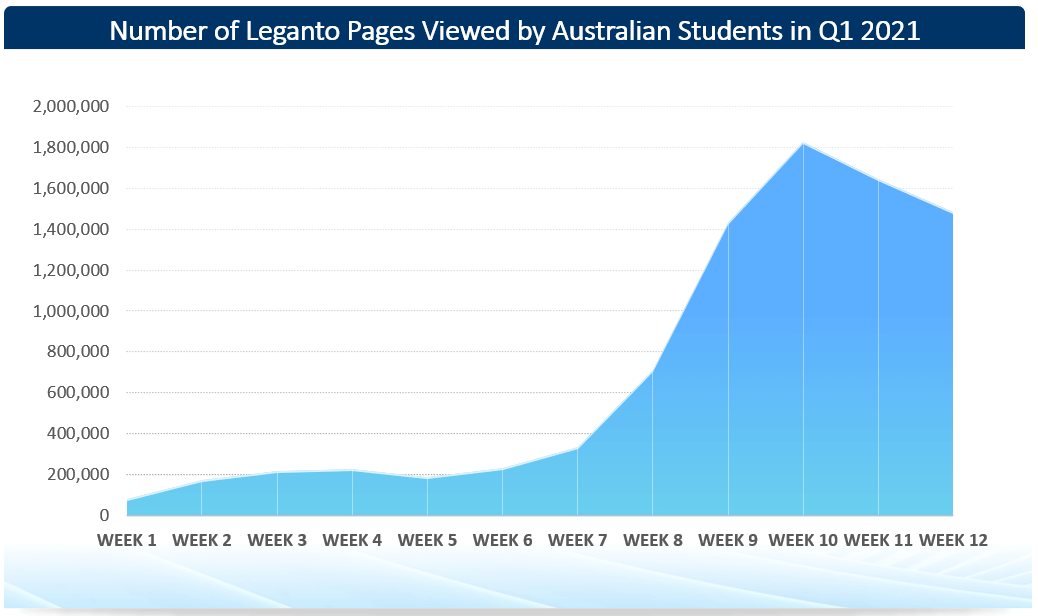 We also track Leganto page views, a raw number indicating how many “hits” Leganto gets from students. Across Australia, Leganto was accessed over 1.8 million times in a single week of the first academic term (in this case, the first week of March 2021)!